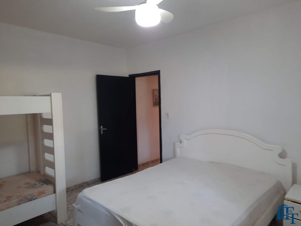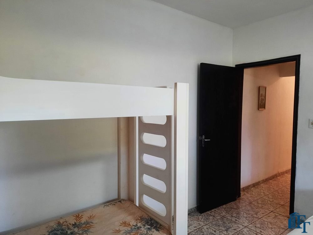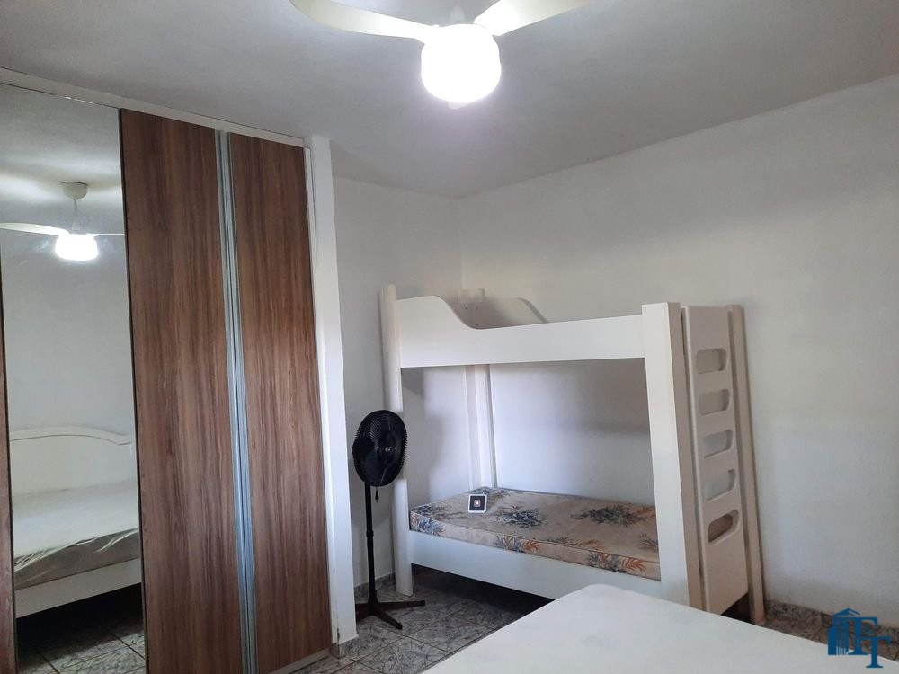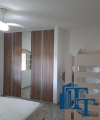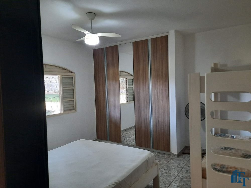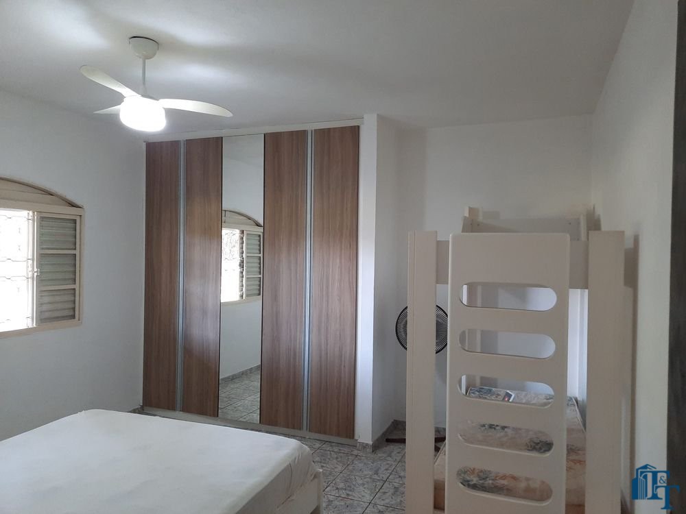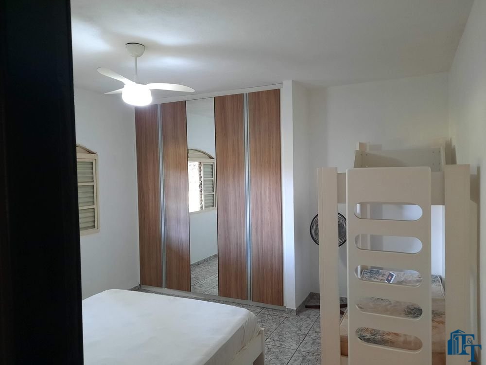 Cama de casal em madeira maciça, dois beliches do mesmo material, armário embutido, mesa de cabeceira e ventilador de teto.