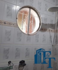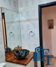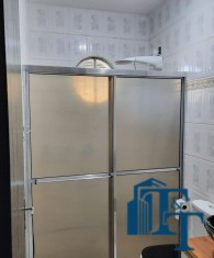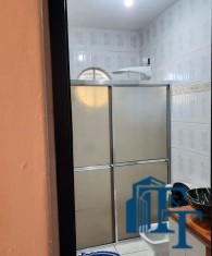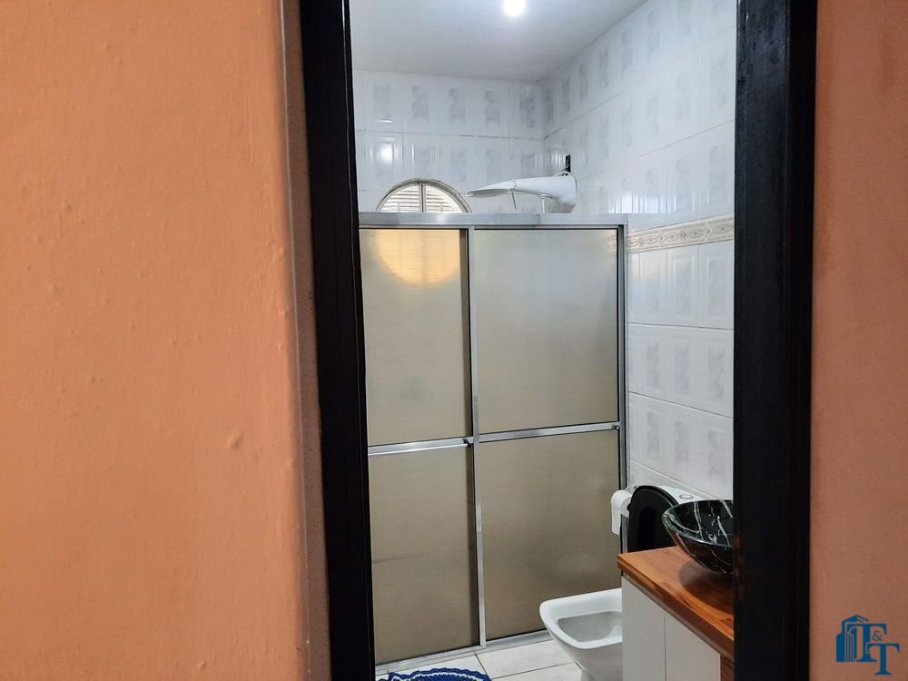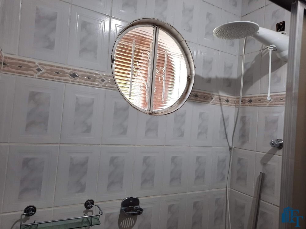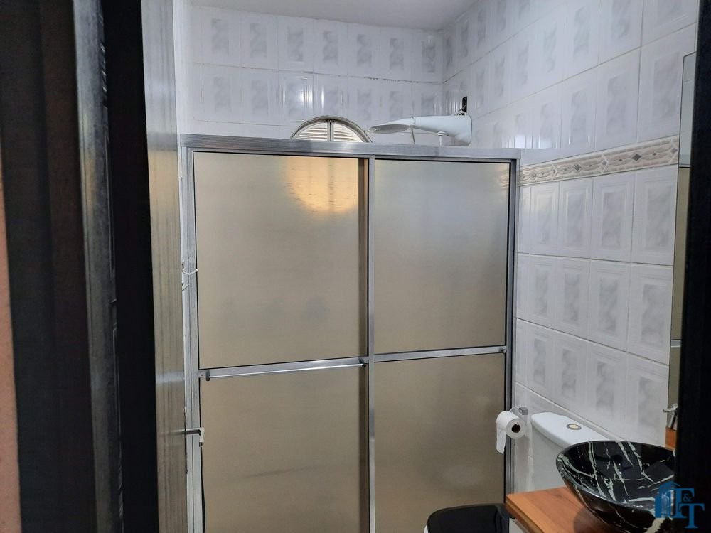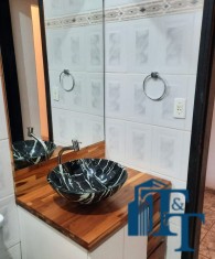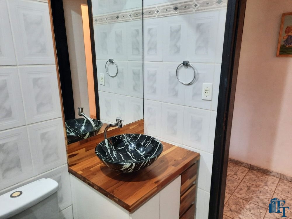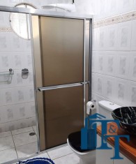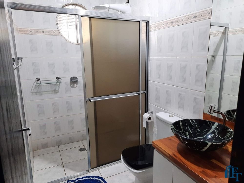 Além do vaso, cuba sobreposta em vidro decorado e armário embutido com espelho e na área de banho box e chuveiro.