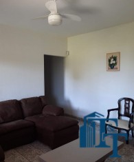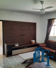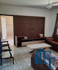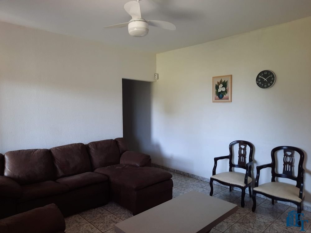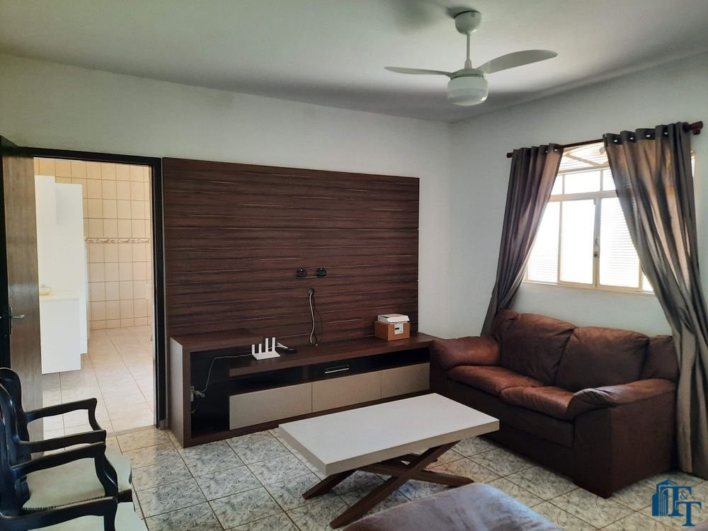 Móvel para TV, 2 sofás com 3 e 2 lugares, mesa de centro em madeira, duas cadeiras estilo provençal com braço, ventilador de teto e cortinas.