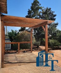 As paredes externas da casa e da área gourmet é com tijolinho à vista do tipo aparente. As janelas e portas são contornadas com molduras que dão graça e elegância a estética da casa. Dez colunas de tijolinhos á vista aparentes sustentam o telhado da varanda. As janelas, vitrôs  e porta de entrada(sala e cozinha) são de ferro e as portas internas em madeira. Na área gourmet  há cortinas em lona.
