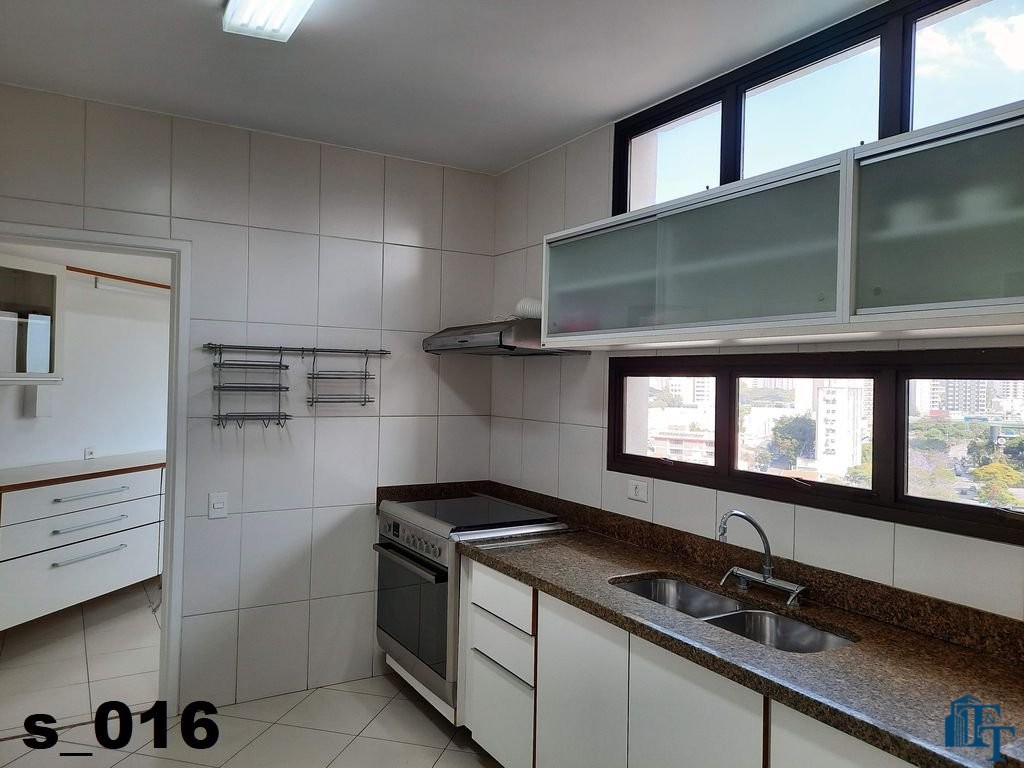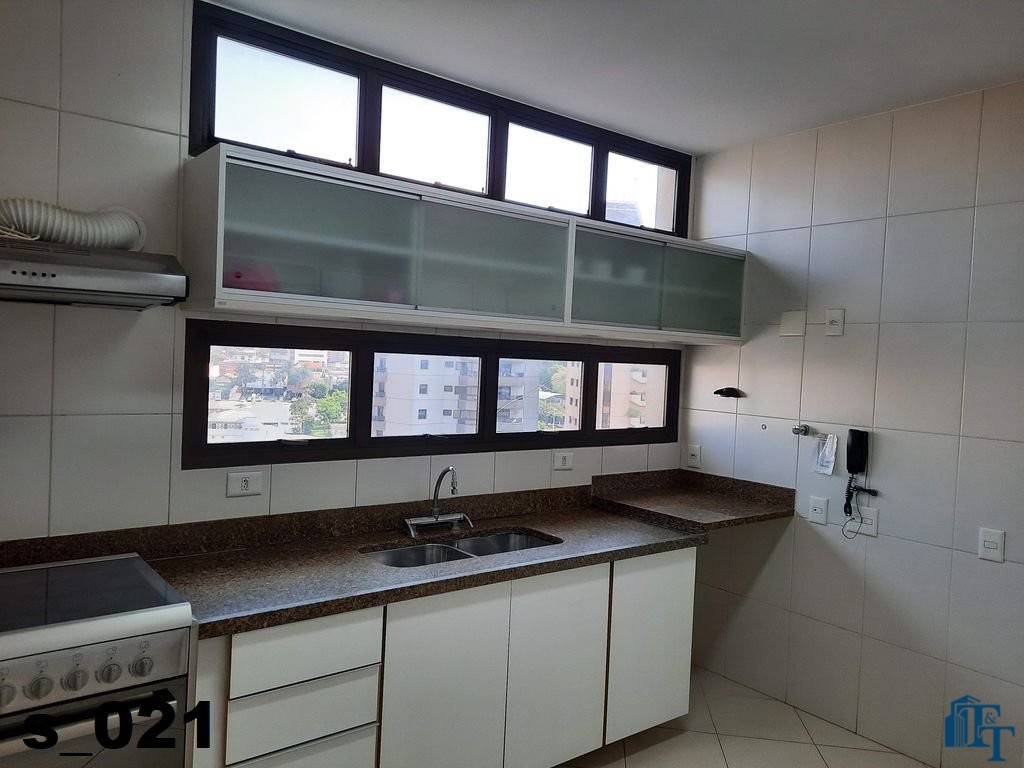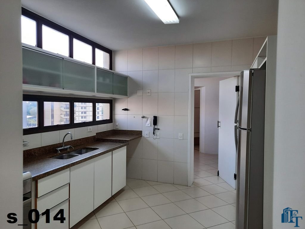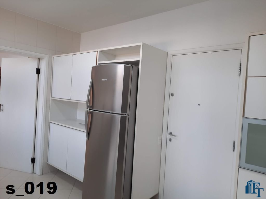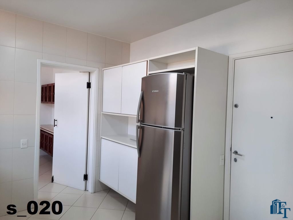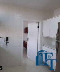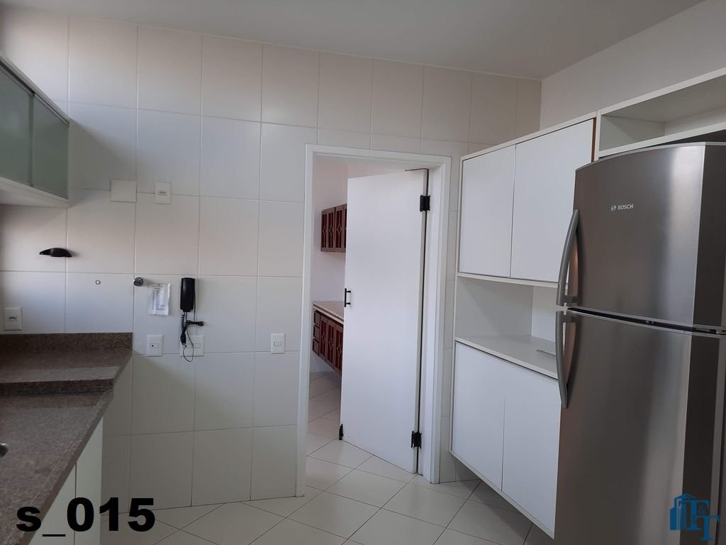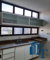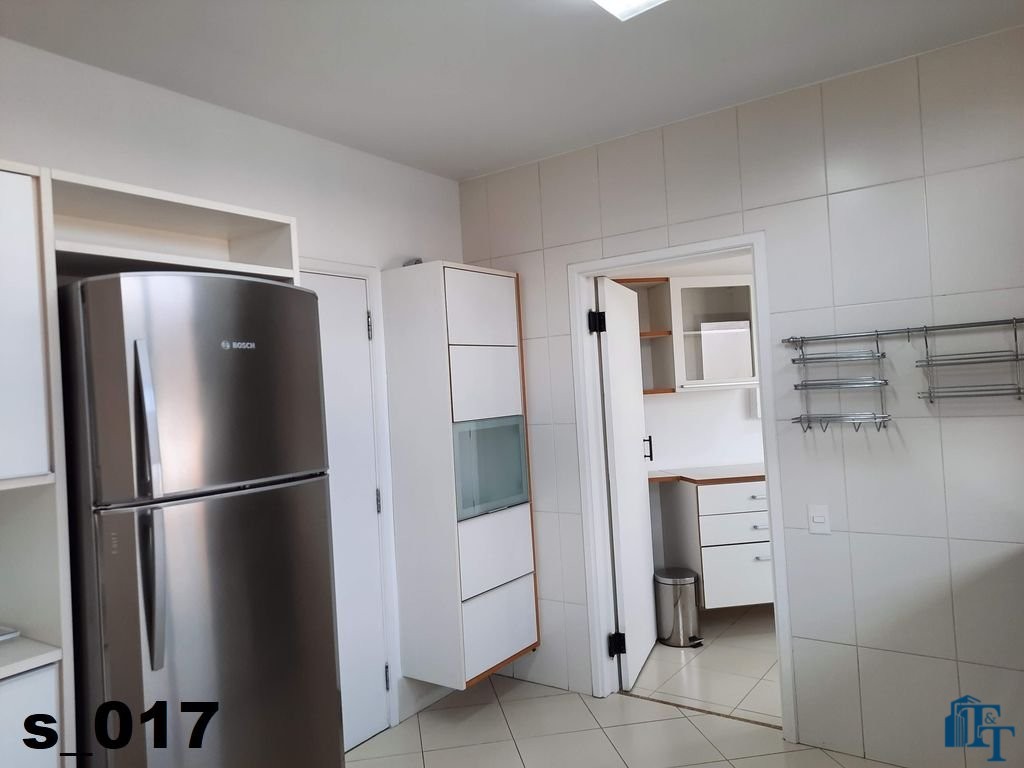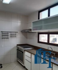 A cozinha ampla e equipada com armários planejados em madeira branca, geladeira de inox prata da Bosch de um lado e do outro lado estão instaladas uma enorme pia em granito com bancada, um fogão de 6 bocas e armário de apoio aos serviços da cozinha e claro a ventilação e iluminação do ambiente ocorre da mesma forma da sala de jantar, dois conjuntos de janelas em alumínio bronze;