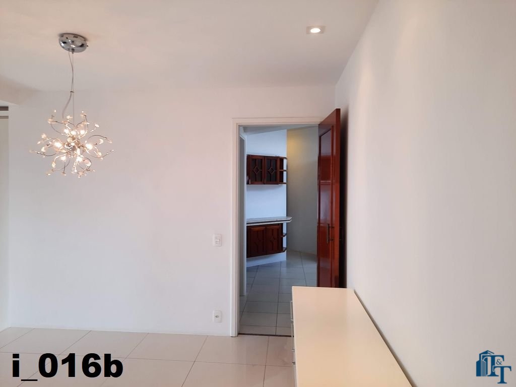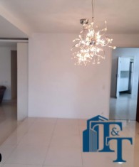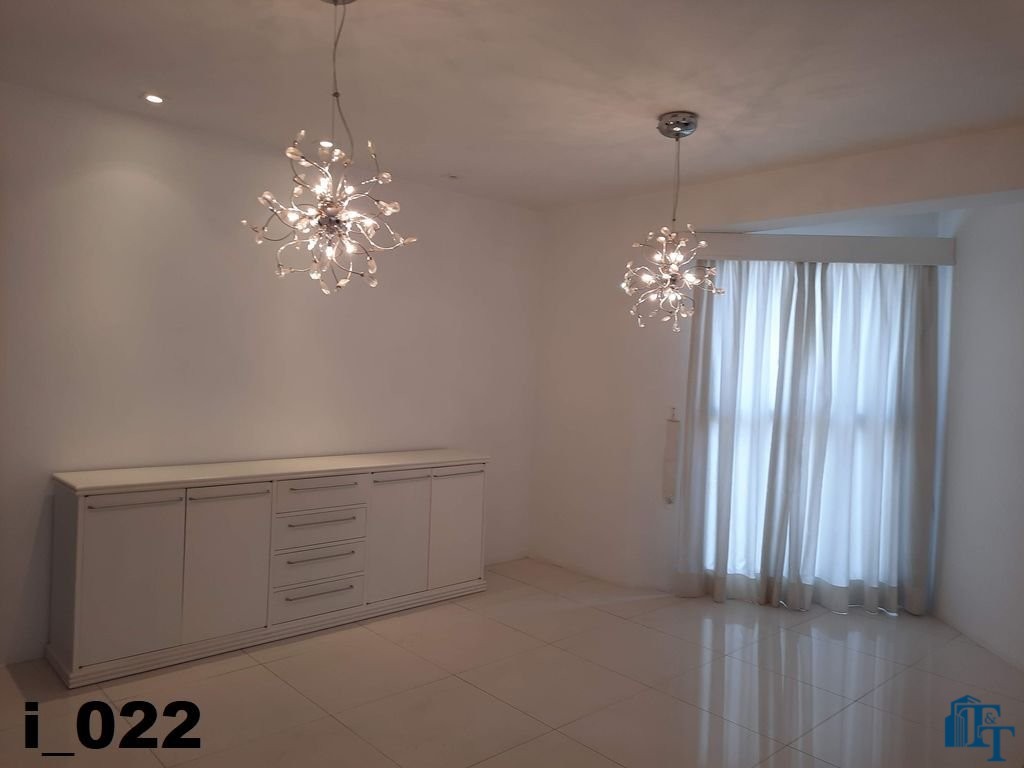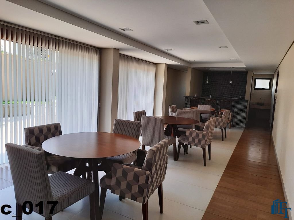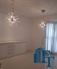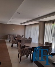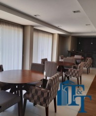 Em continuidade a toda a esta sofisticação, a sala de jantar foi planejada com pequena elevação no piso para dar destaque e manter a classe aos ambientes, o revestimento do piso é o mesmo da sala de estar, ou seja, porcelanato branco. Os lustres oferecem um destaque especial a sala, o que pode ser conferido nas fotos. Neste ambiente que é bem amplo, além da visão da varanda, podemos observar a cidade por uma janela em alumínio na cor bronze (padrão para todos os cômodos) e que sugestiona uma pequena sacada. Um balcão enorme, compõem o ambiente;