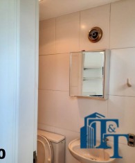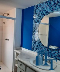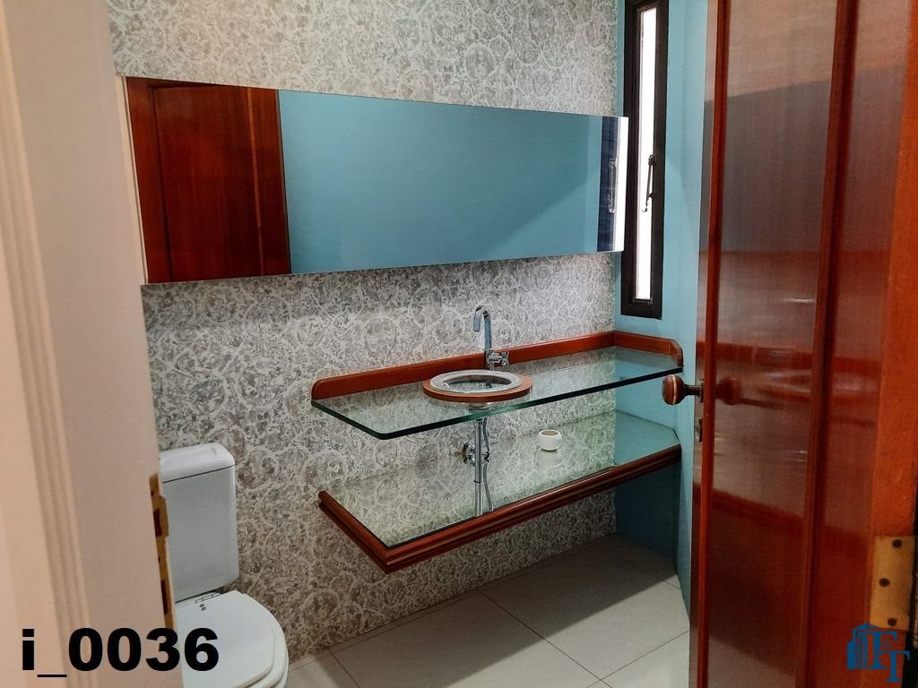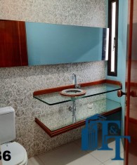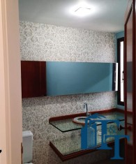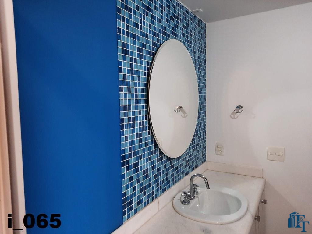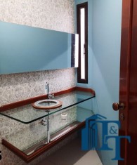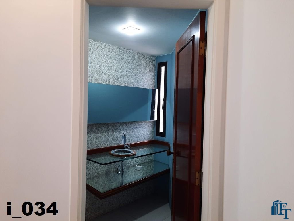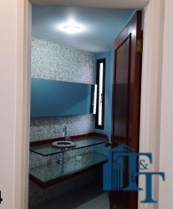 Hall logo na entrada do apartamento com acesso a um belíssimo lavabo, atendem logo na entrada a necessidade dos moradores ou visitantes. Ambiente este que conta com o revestimento do piso em porcelanato branco e uma luxuosa pia e cuba de vidro blindado de espessura reforçada e para revestir uma parede um papel em cor nobre e arabescos que oferecem destaque a parede principal e um espelho que acompanha toda a parede decorada;