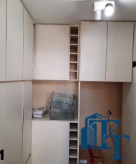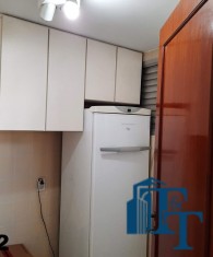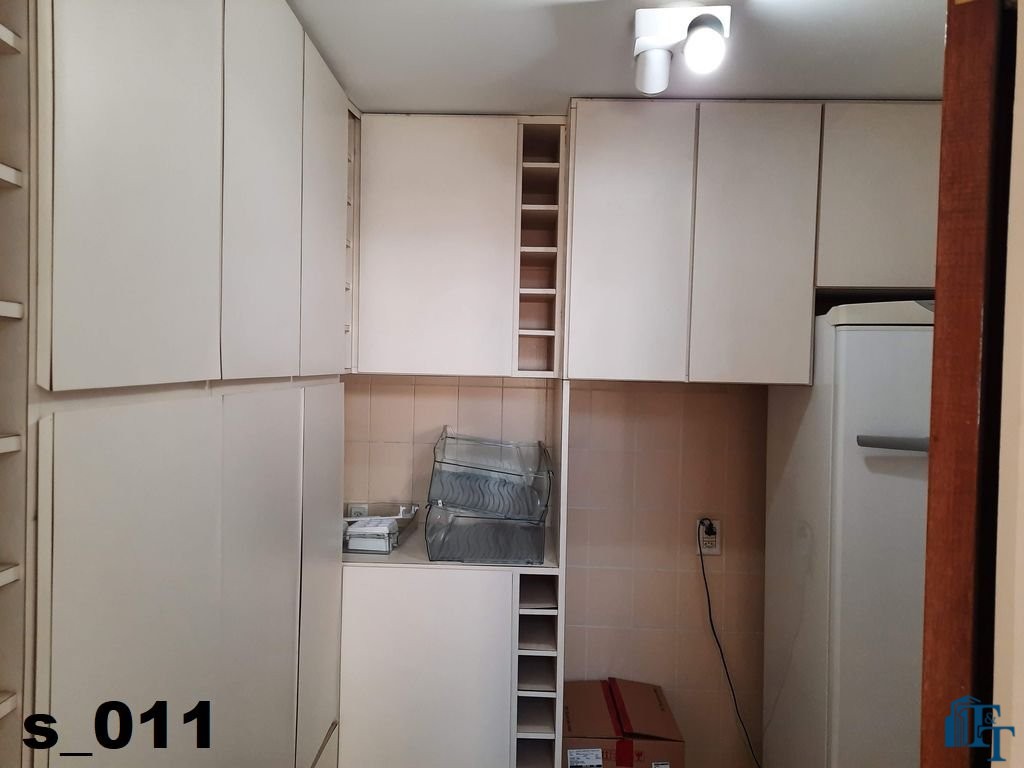 A despensa é o próximo ambiente que podemos acessar pela copa, é separado da copa repleta de armários branco e geladeira de armazenamento, de extrema utilidade e apoio a cozinha, é um ambiente claro e com ventilação por uma janela;