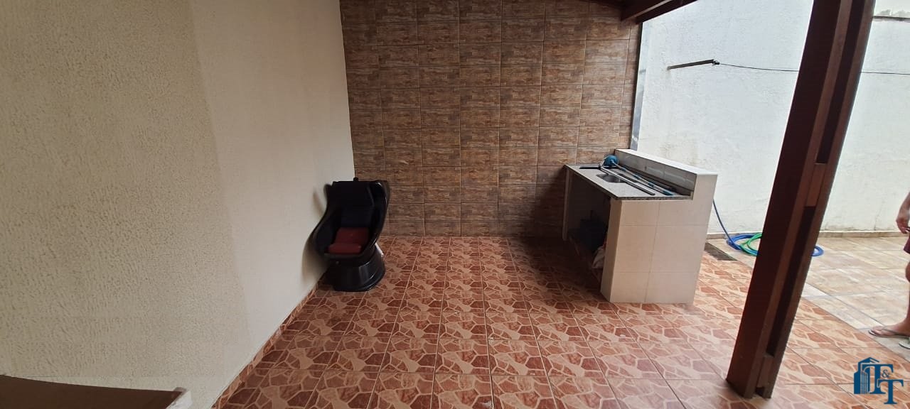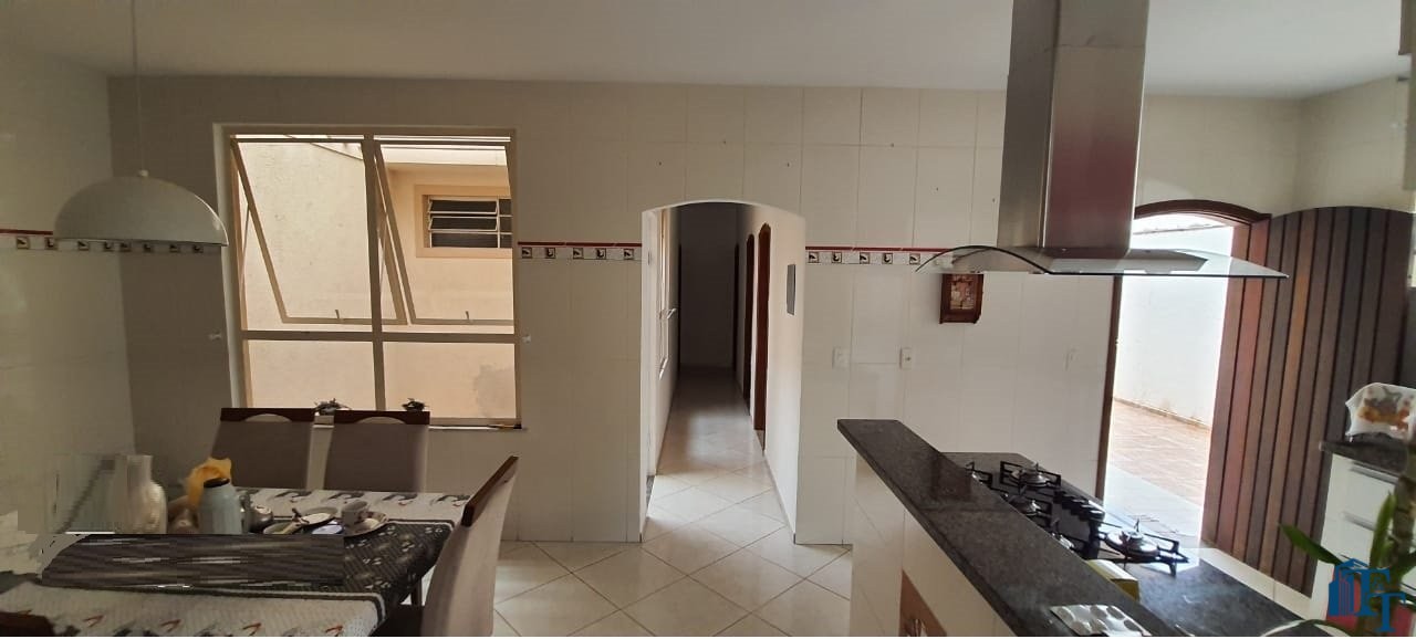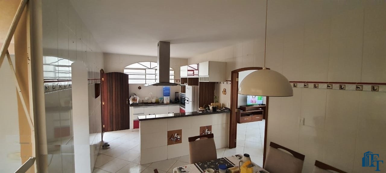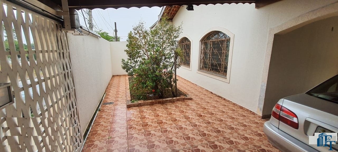 Casa térrea à venda, 3 dormitórios, sendo 1 suíte com guarda roupa embutido, jardim de inverno, 1 banheiro social, cozinha americana conjugada com a copa, tendo coifa de vidro, cooktop, forno embutido e armários planejados, sala dois ambientes, nos fundos, tem outra suíte, com uma cozinha aberta com pia... Mas, na verdade, nesse espaço coberto esta reservado para ser uma área gourmet. Garagem para até 3 carros, sendo 2 vagas cobertas e 1 descoberta. Na frente tem um jardim.