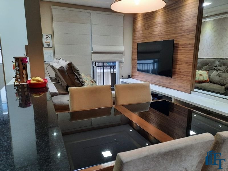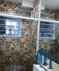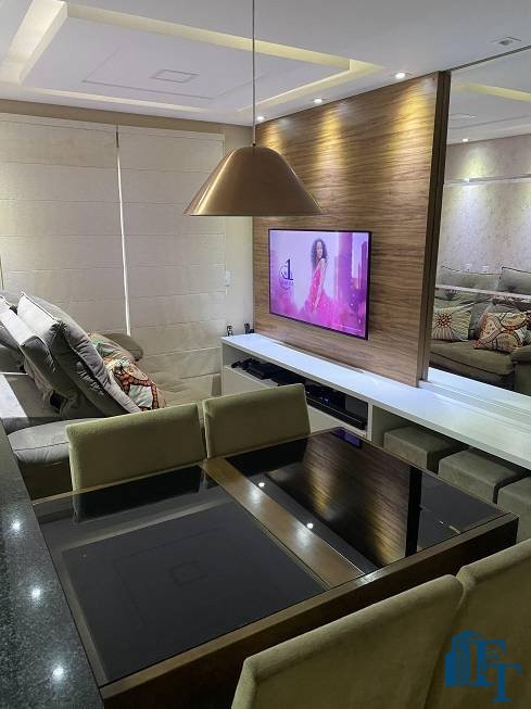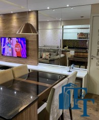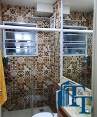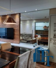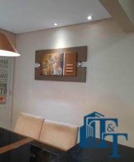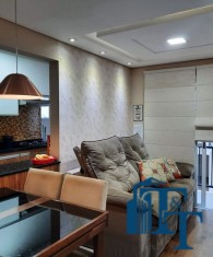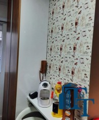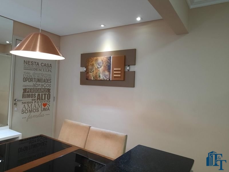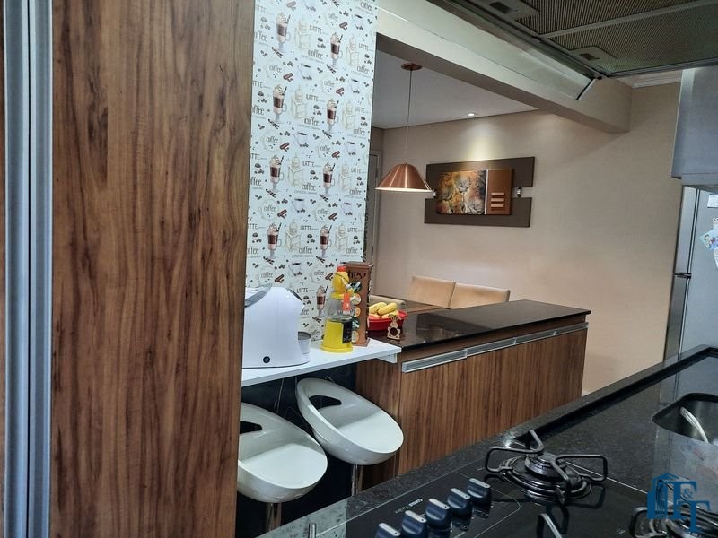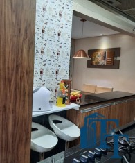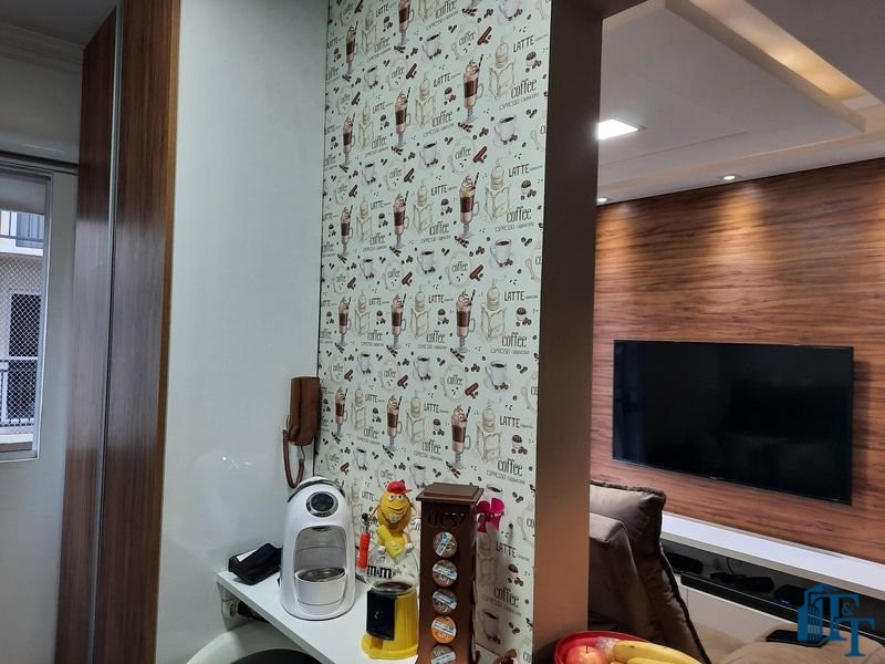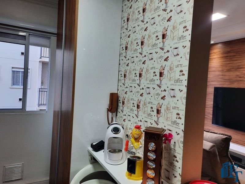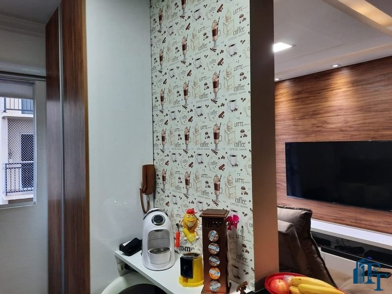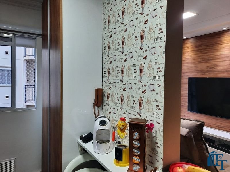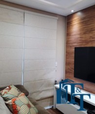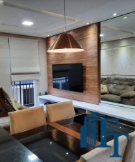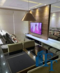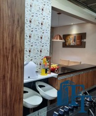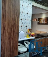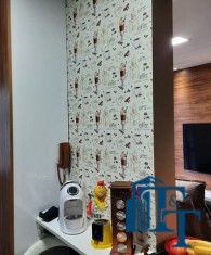 O revestimento do piso das áreas molhadas é cerâmico e nos dormitórios e na sala o  revestimento escolhido foi  o vinílico de 5 milímetros clicado, marca Decaflor. Na sala o teto é rebaixado (sanca) com sistema de luz tripla e em uma das paredes foi instalado um charmoso e sofisticado papel de parede que  compõe à sala. De forma planejada, um lindo painel  para a TV com vidros ocupam a outra parede da sala, deixando ainda mais sofisticado os ambientes: sala de estar e jantar.  Na cozinha o revestimento da parede é de pastilha de vidro em cores harmônicas e de acabamento fino. No mesmo ambiente um belíssimo cantinho para o café foi decorado pelos proprietários para garantir um ambiente ainda mais aconchegante para os moradores.  Lindos lustres completam a decoração de cada ambiente.