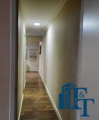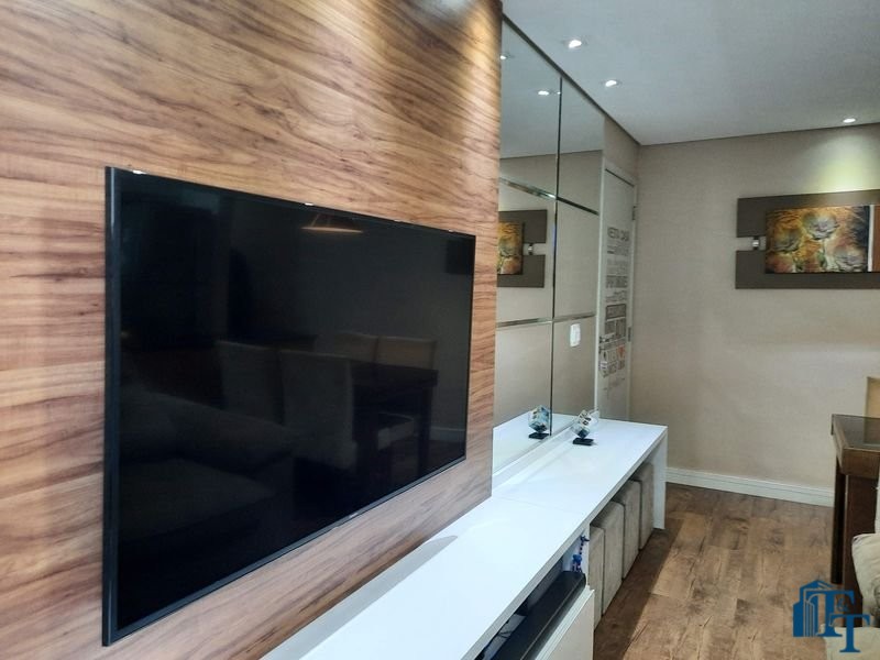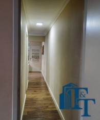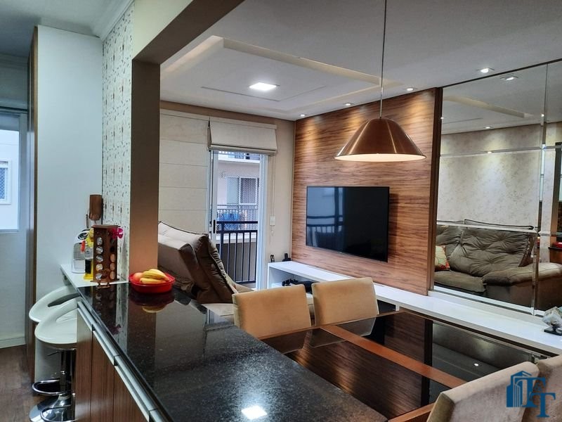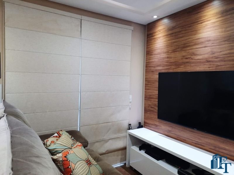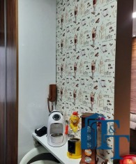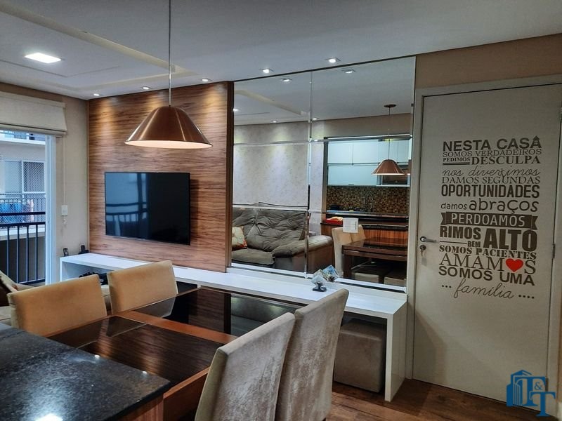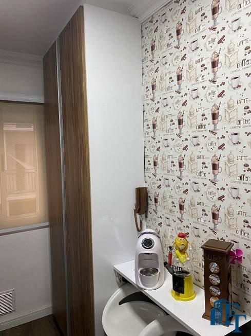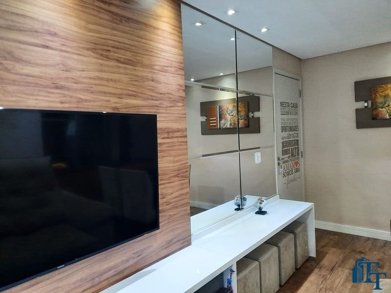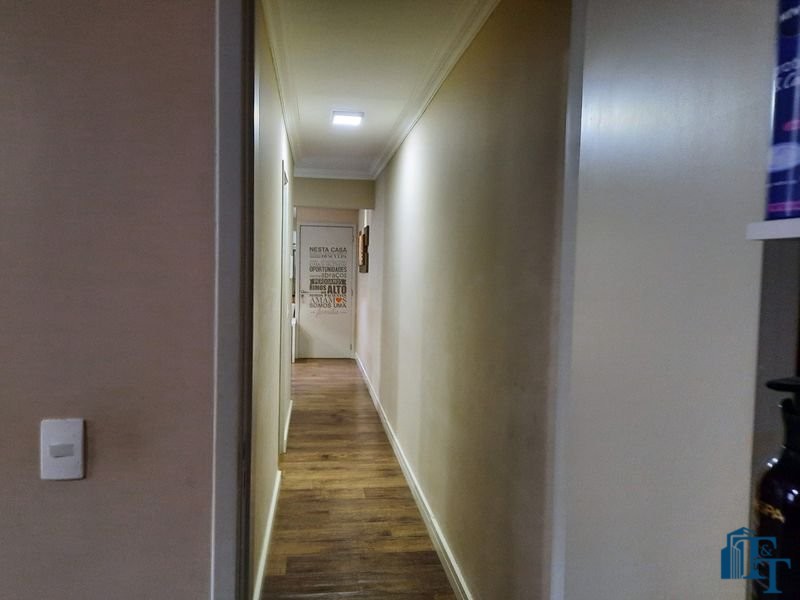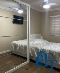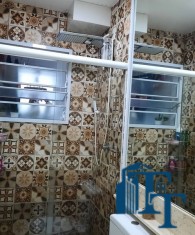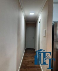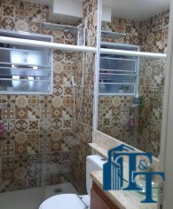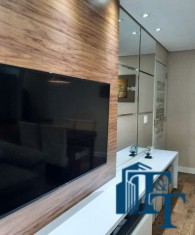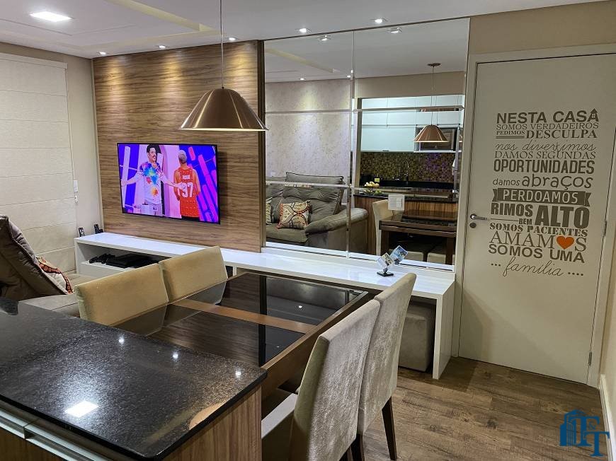 O revestimento do piso das áreas molhadas é cerâmico e nos dormitórios e na sala o  revestimento escolhido foi  o vinílico de 5 milímetros clicado, marca Decaflor. Na sala o teto é rebaixado (sanca) com sistema de luz tripla e em uma das paredes foi instalado um charmoso e sofisticado papel de parede que  compõe à sala. De forma planejada, um lindo painel  para a TV com vidros ocupam a outra parede da sala, deixando ainda mais sofisticado os ambientes: sala de estar e jantar.  Na cozinha o revestimento da parede é de pastilha de vidro em cores harmônicas e de acabamento fino. No mesmo ambiente um belíssimo cantinho para o café foi decorado pelos proprietários para garantir um ambiente ainda mais aconchegante para os moradores.  Lindos lustres completam a decoração de cada ambiente.