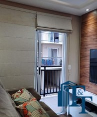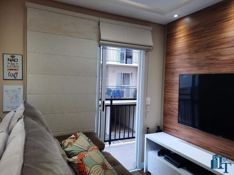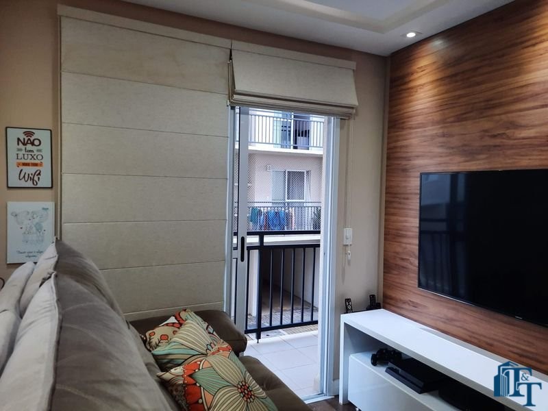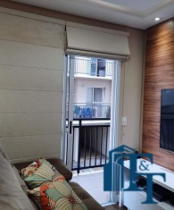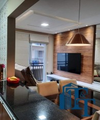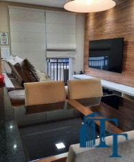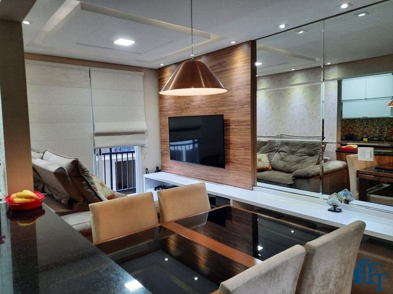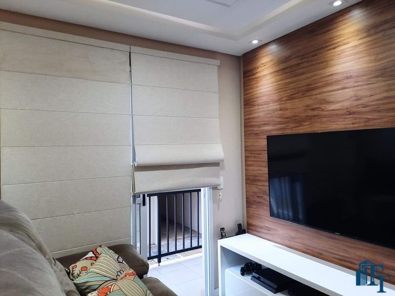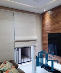sala dois ambientes (TV e jantar), com  ampla sacada e persianas romanas;
