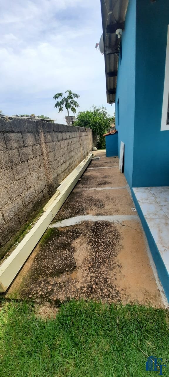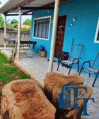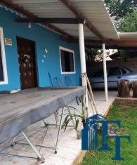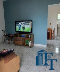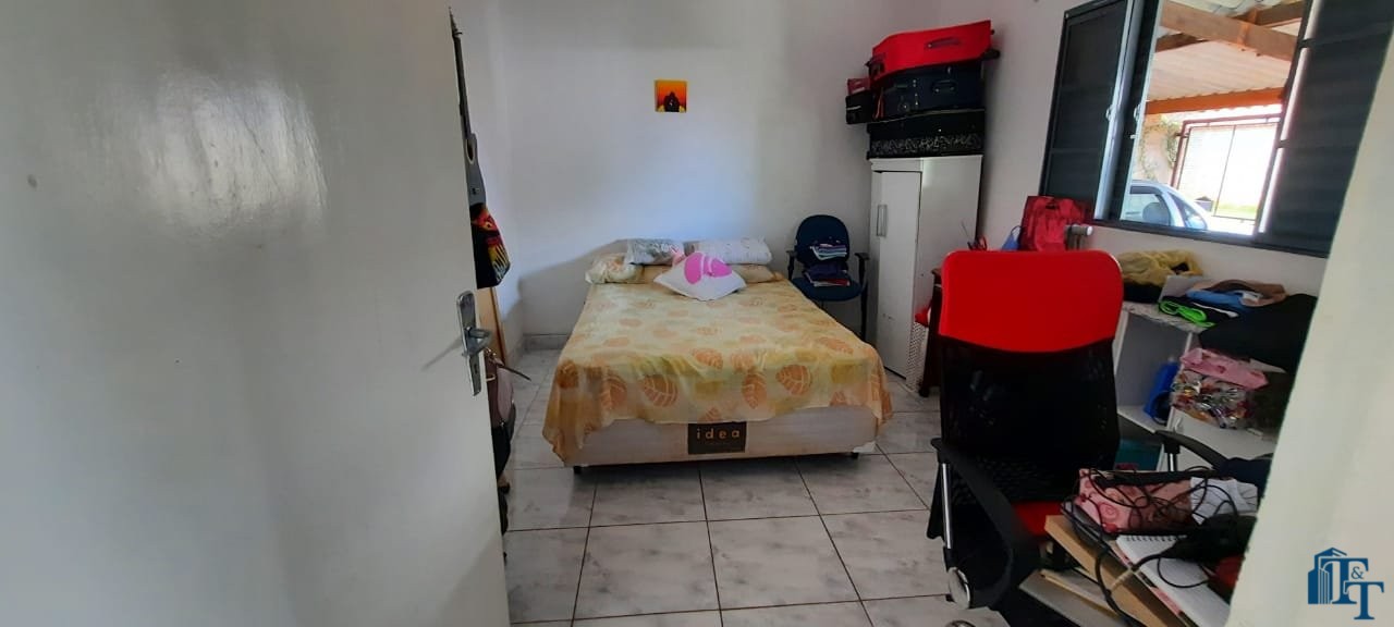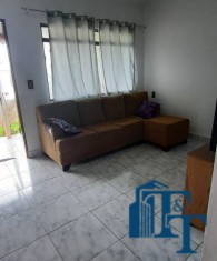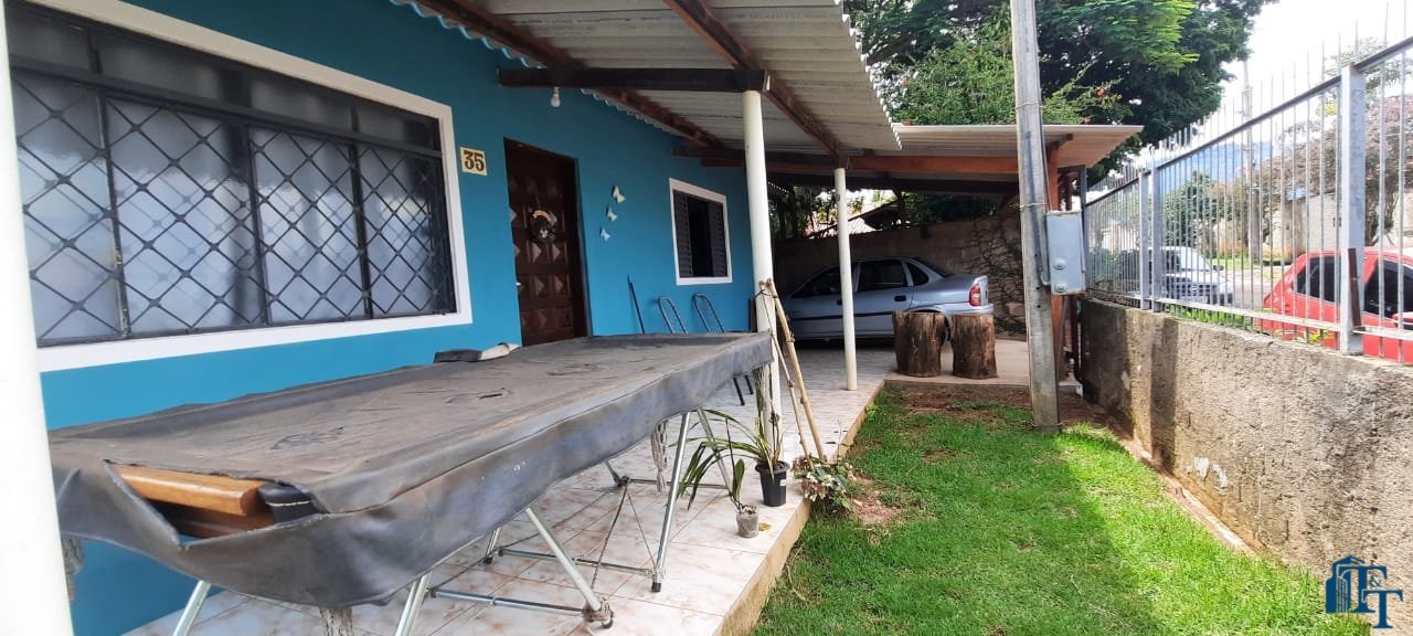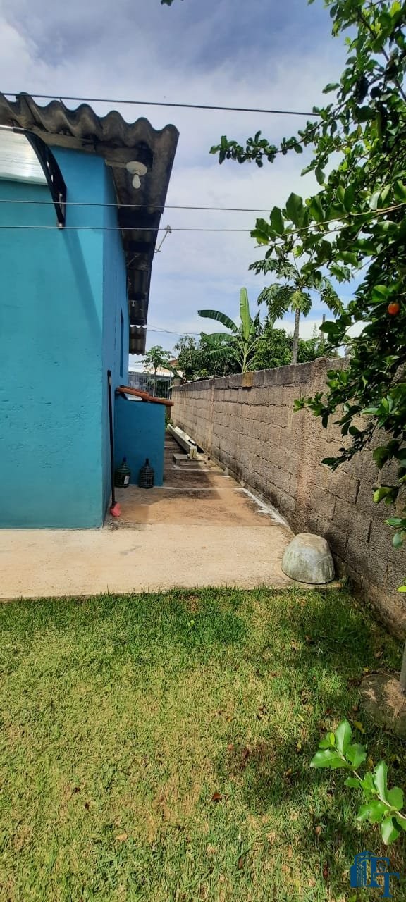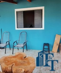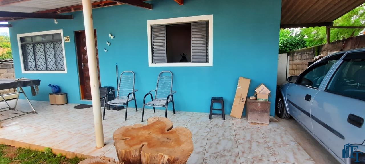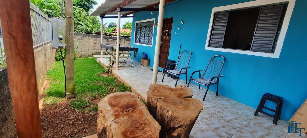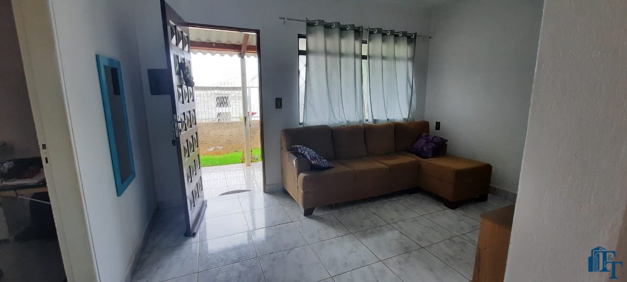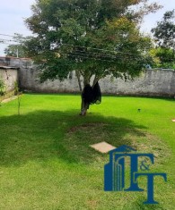 Casa térrea em laje e área coberta, com 2 dormitórios, sala, cozinha, banheiro, 2 vagas de garagem coberta e quintal enorme e gramado.