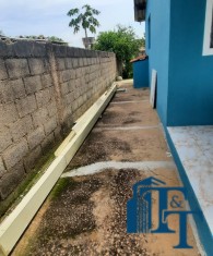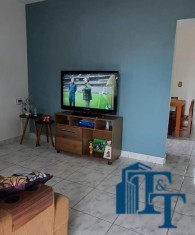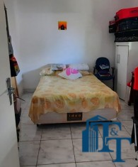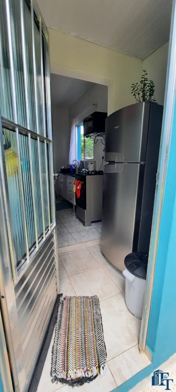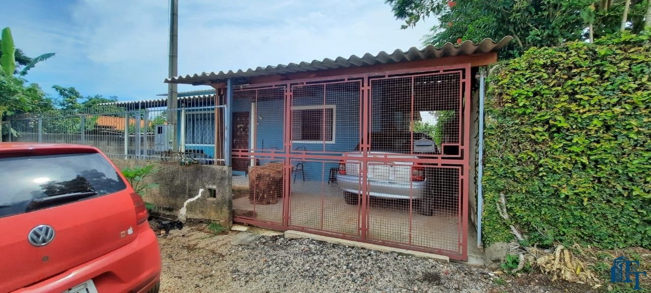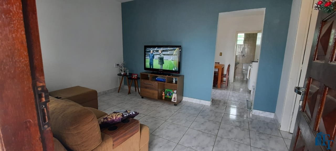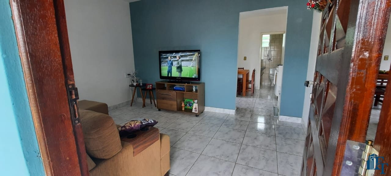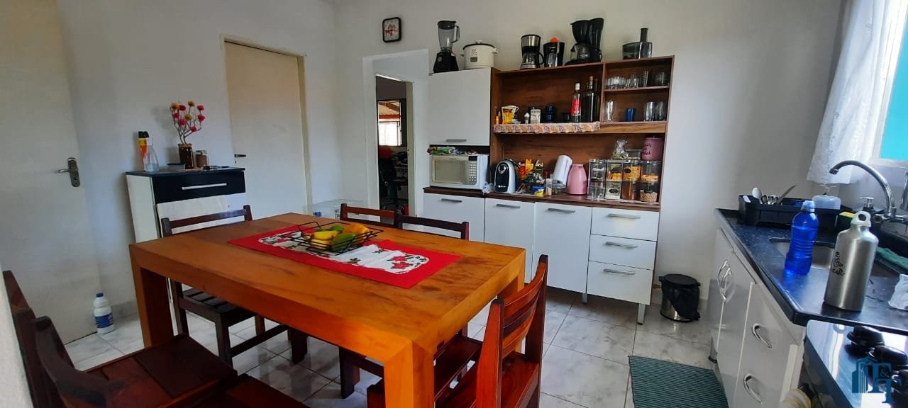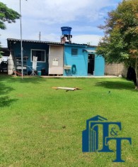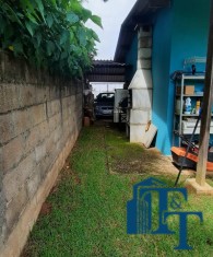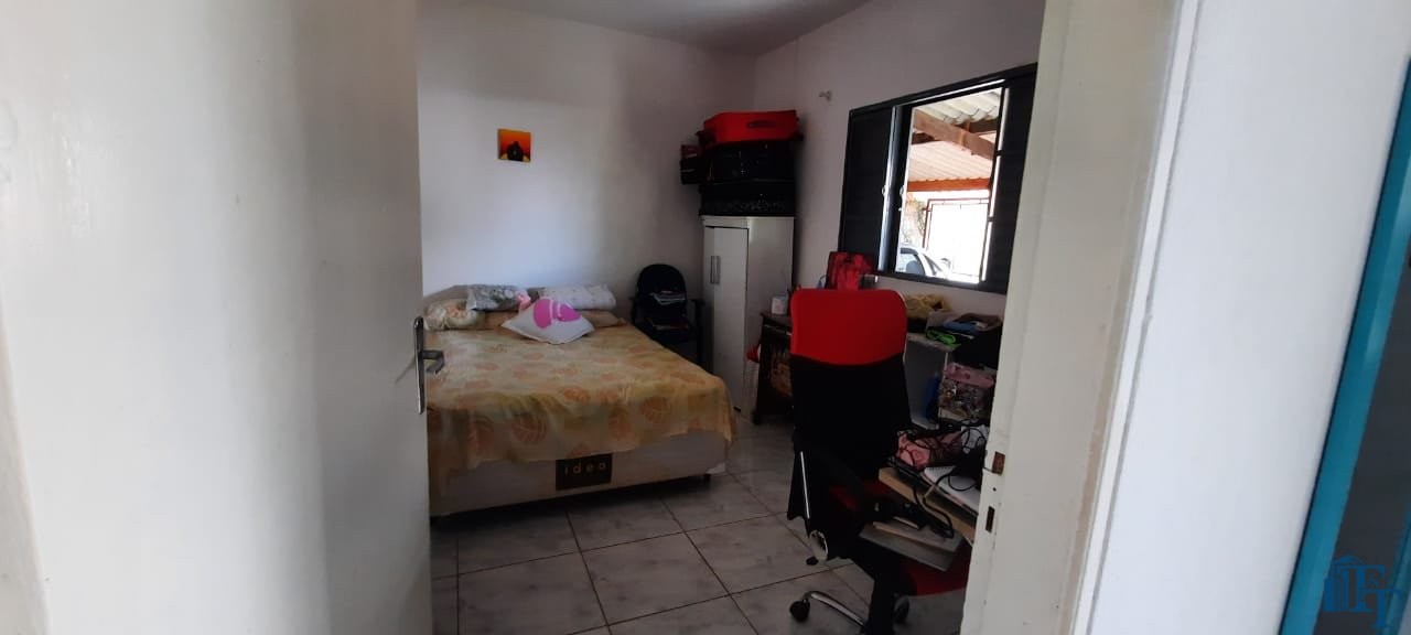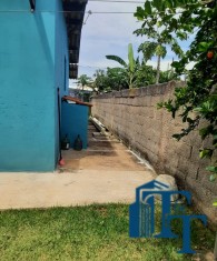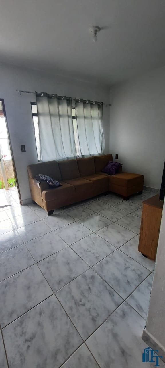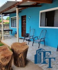 Casa térrea em laje e área coberta, com 2 dormitórios, sala, cozinha, banheiro, 2 vagas de garagem coberta e quintal enorme e gramado.